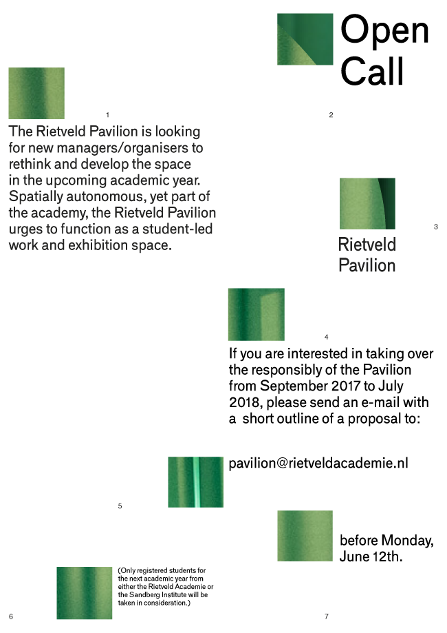 If you are interested in taking over the responsibly of the Pavilion from September 2017 to July 2018, please send an e-mail with a short outline of a proposal to pavilion@rietveldacademie.nl before Monday, June 5th.